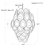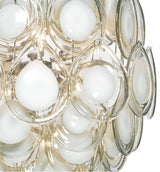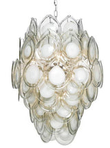 Grey-colored teardrop-shaped glass discs with a milky center hang delicately layered on the Diva chandelier creating a beautiful warm glow. Hang in a bedroom for dreamy ambient light. The chandelier is from Regina Andrews Detroit.
