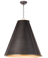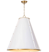A cone silhouette is trimmed with a natural brass ring on the top and bottom of the French Maid chandelier. Brass studs provide an industrial detail and a diffuser shade provides nice ambient light for a kitchen island.  The French Maid chandelier is from Regina Andrew.