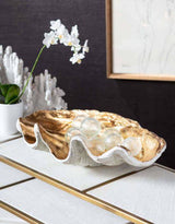 A large clam shell with gold interior works as a decorative bowl with beachy charm. Position on an entryway table or living room table to hold objects or other important items. Also available in a smaller size. the clam shell is from Regina Andrew.