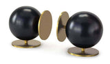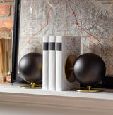 The substantial aesthetic of these bookends from Regina Andrew creates a natural focal point for your tabletop, bookshelf, desk or etagere. Whimsically modern, these bookends have substance with their natural brass disc bases and black patinaed metal spherical bodies.