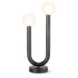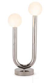 The Happy Table Lamp is a unique mix of modern and playful. Happy's simple, asymmetrical charm creates uplifting illumination perfect for an entryway, bedroom or living space. The lamp's metal tube frame, cylindrical base and contrasting matte white glass globes create an elevated take on a playful shape. Create the perfect amount of custom illumination in your space by using the lamp's dimmer switch. The table lamp is from Regina Andrew.