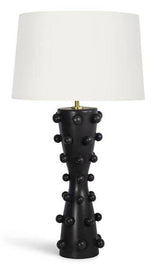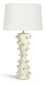 A Contemporary work of art in its own right, the Pom Pom Ceramic Table Lamp is both Modern and fun, adding texture and drama along with functionality. Pom Pom's elongated hourglass base is dotted with modern ceramic spheres, each hand formed and applied. Finished with a crisp, natural linen shade, and natural brass neck and ball finial, the Pom Pom is the perfect addition to your eclectic space. The lamp is from Regina Andrew.