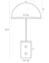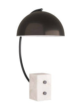 Introducing the Weslan Lamp, a pharmacy-style lamp with old-meets-new vibes. The task lamp features a domed, English bronze-finished steel metal lamp shade lined in white lacquer. A C-shaped arm connects the the lamp to a geometric white alabaster base. Finish may vary.