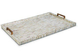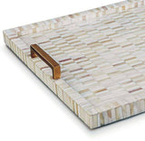Adding luxury and style to your bedroom, living or entertainment space, this rectangular tray is covered in hand inlay natural bone with a mosaic pattern that creates a rich composite for staging objects d'art to personal accessories. Fitted with natural brass handles make it easy to re position and transport the tray while adding a visually appealing element. The tray is from Regina Andrew.